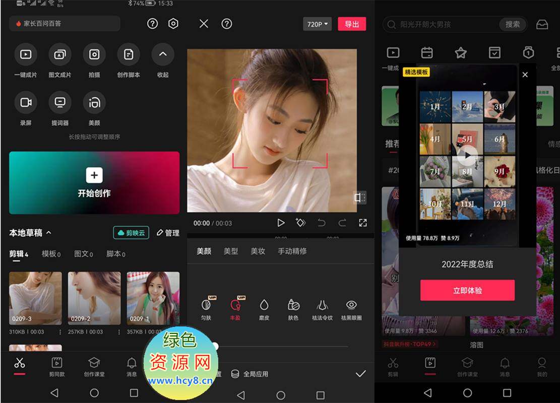 抖音剪映安卓版是抖音短视频为创作人推出的一款视频合成工具及视频剪辑软件。剪映app提供大量创作人草稿模板,合成视频简单易学,视频编辑具有切割变速倒放,转场,贴纸和文字,各种滤镜特效及一键美颜等功能。绿色资源网收集整理的剪映破解版为用户解锁了所有的功能以外,还附有海量的vip素材使用特权,导出无水印,让大家更舒心的完成制作,对此需要的朋友不妨来下载收藏吧。